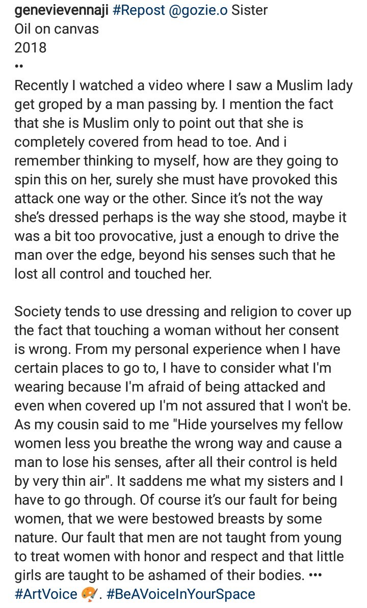 In her post, Genevieve spoke about men sexually harassing women yet blaming the woman for bringing it upon herself through her dressing. The actress then went on to point out that Muslim women covered from head to toe also get harrassed and wondered what that would be blamed on.
