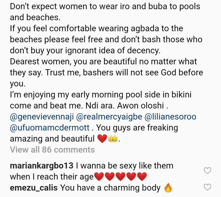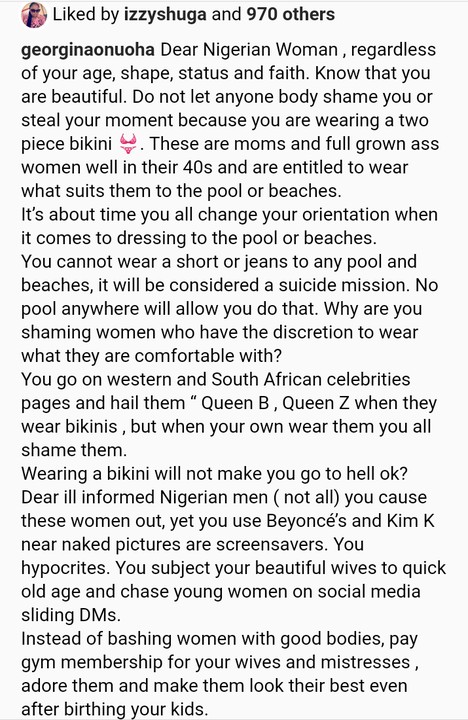 Popular nollywood actress Georgina Onuoha shares some trending bikini photos of nigerian actress as she advice nigerian women not to allow anybody to body shame them regardless of their age and and their body shape