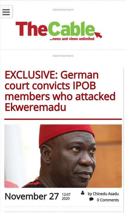 Germany has convicted four members of the Indigenous People of Biafra (IPOB) who attacked Ike Ekweremadu, former deputy senate president, TheCable can report.