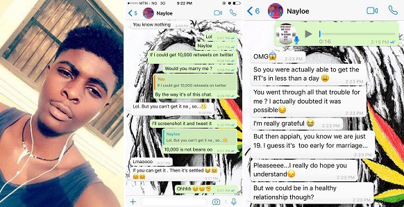 There’s a trending story on Twitter right now, and it’s between a 19-year-old Nigerian Guy, Appiah Morris and His 19-year-old crush, Nayloe.It all started when Morris took to Whatsapp to ask his 19-year-old crush, to marry him..