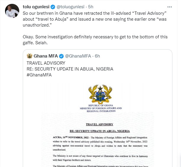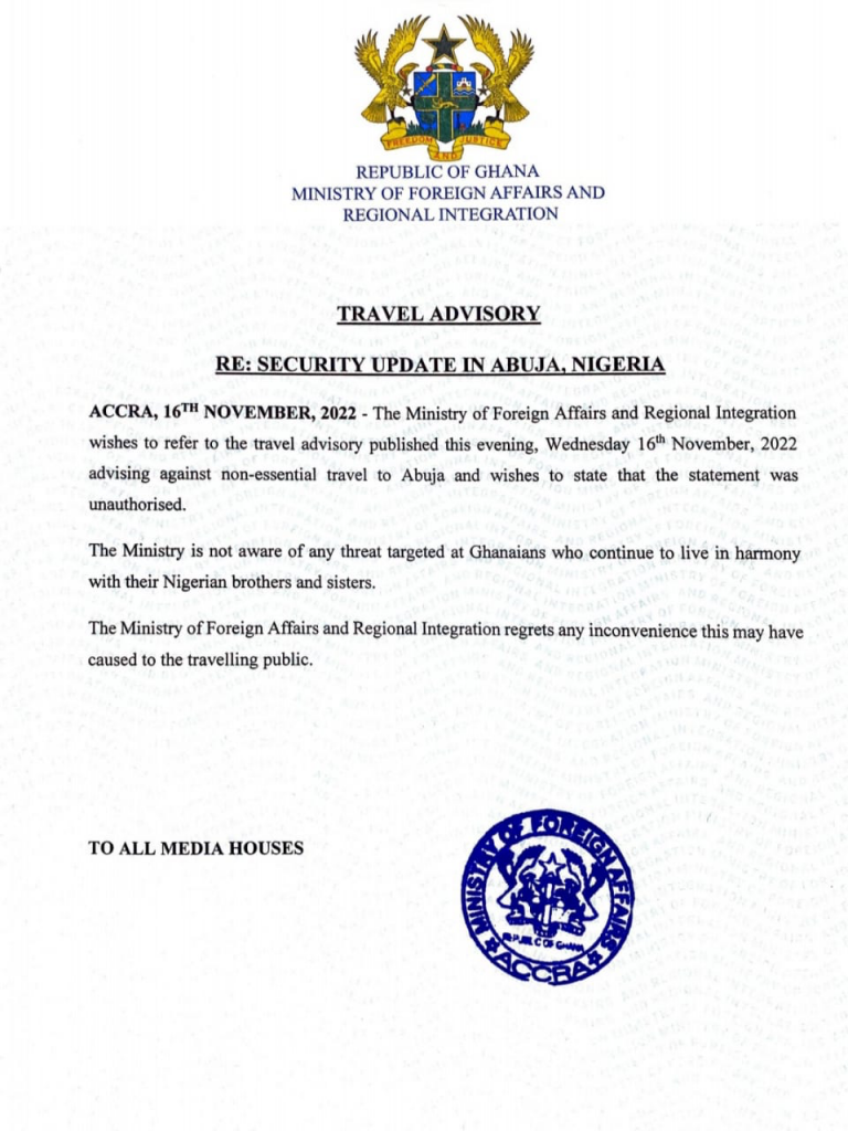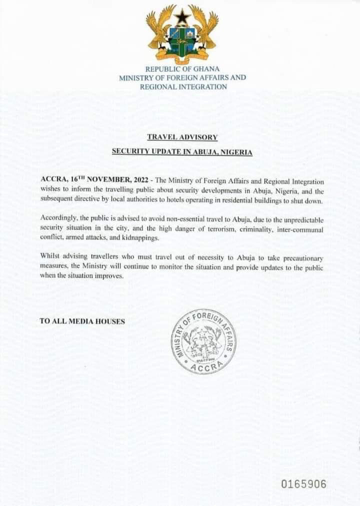 TRAVEL ADVISORYRE: SECURITY UPDATE IN ABUJA, NIGERIA#GhanaMFA