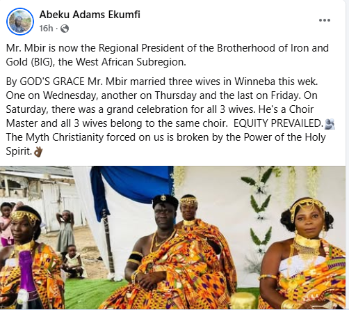 “By GOD’S GRACE Mr. Mbir married three wives in Winneba this week. One on Wednesday, another on Thursday and the last on Friday. On Saturday, there was a grand celebration for all 3 wives.
