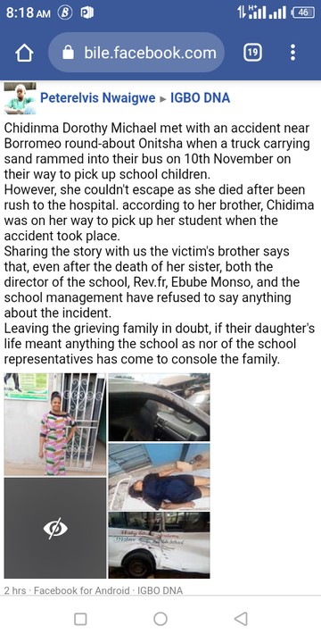 Chidinma Dorothy Michael met with an accident near Borromeo round-about Onitsha when a truck carrying sand rammed into their bus on 10th November on their way to pick up school children, NaijaCover Reports.