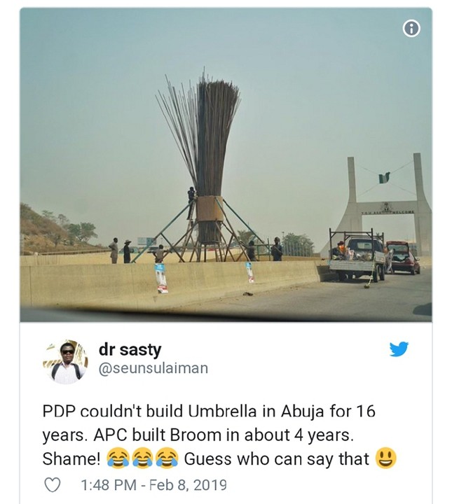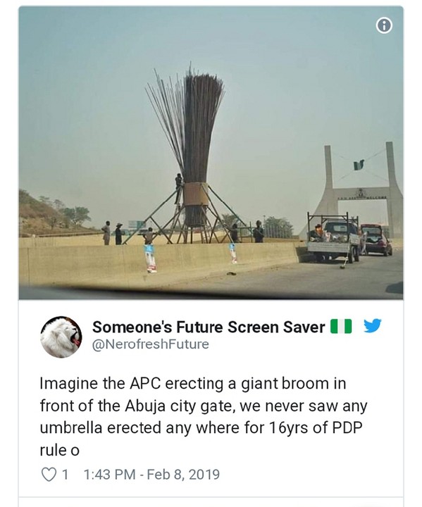 Residents of the Federal Capital Territory (FCT) noted that as of Thursday, it wasn’t clear what was being constructed when they began, but afterwards, it turned out to be the broom symbol of the All Progressives Congress (APC).