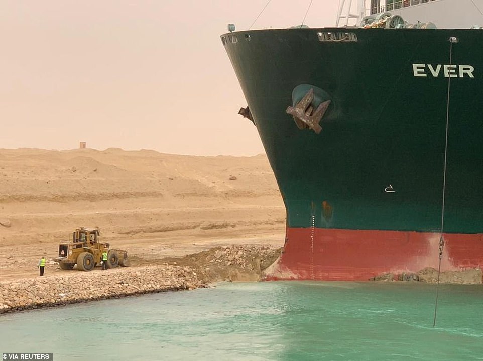 The 1,312ft-long, 175ft-wide, 200,000-ton MV Ever Given drifted across the entire width of the Suez Canal in Egypt around 7.40am Tuesday and became wedged with her bow out of the water against the eastern wall and her stern wedged against the western one.