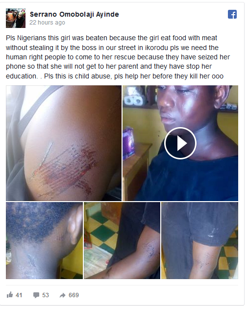 “Pls Nigerians this girl was beaten because the girl eat food with meat without stealing it by the boss in our street in ikorodu pls we need the human right people to come to her rescue because they have seized her phone so that she will not get to her parent and they have stop her education. Pls this is child abuse, pls help her before they kill her ooo