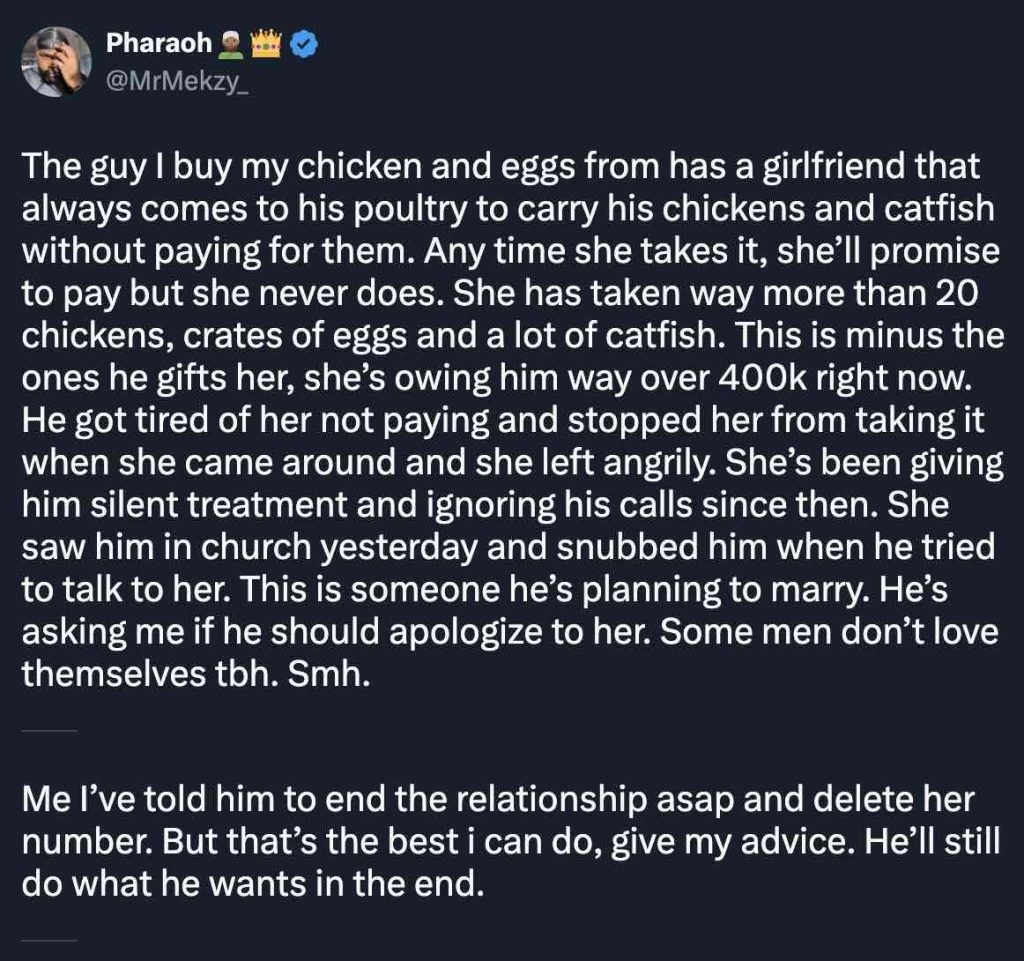 “She has taken way more than 20 chickens, crates of eggs and a lot of catfish. This is minus the ones he gifts her, she’s owing him way over 400k right now. He got tired of her not paying and stopped her from taking it when she came around and she left angrily. She’s been giving him silent treatment and ignoring his calls since then.