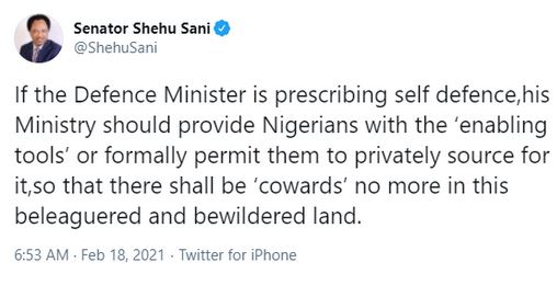 Shehu Sani, a former Nigerian senator has Bashir Salihi Magashi, the defence Minister, asking his ministry to provide Nigerians with tools to defend themselves against bandits, so that there would be no cowards.