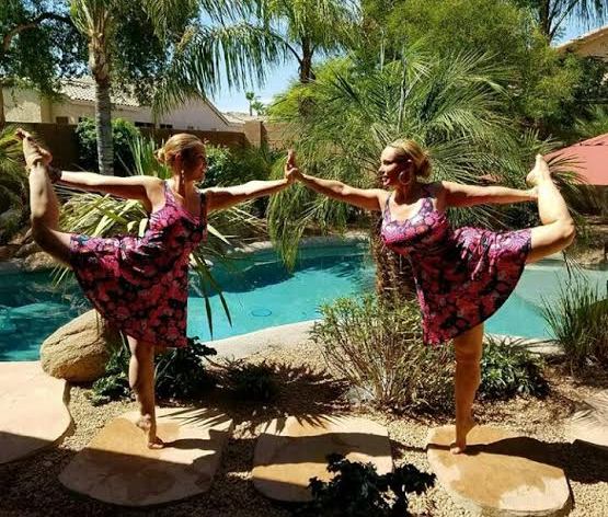 Glamour model Coco & her sister Kristy strike one of their popular yoga poses