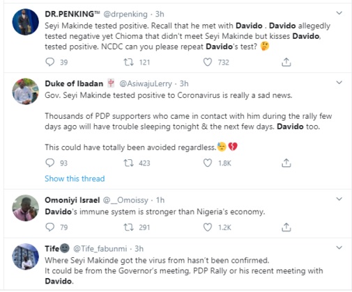 Nigerian musician, Davido has been urged to redo his coronavirus test after news of Governor Seyi Makinde testing positive for Coronavirus was publicized yesterday.