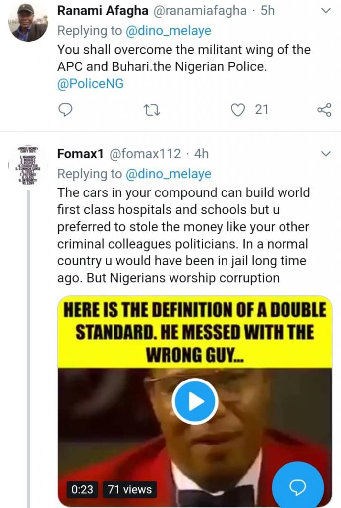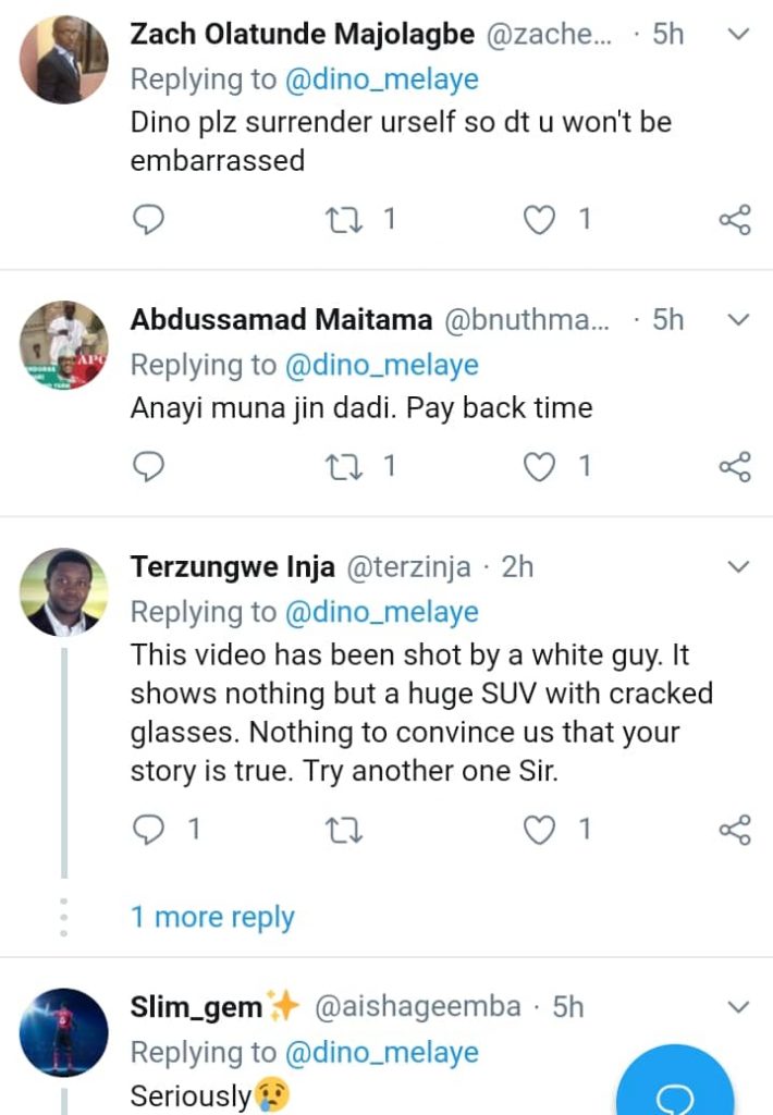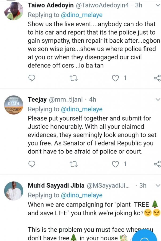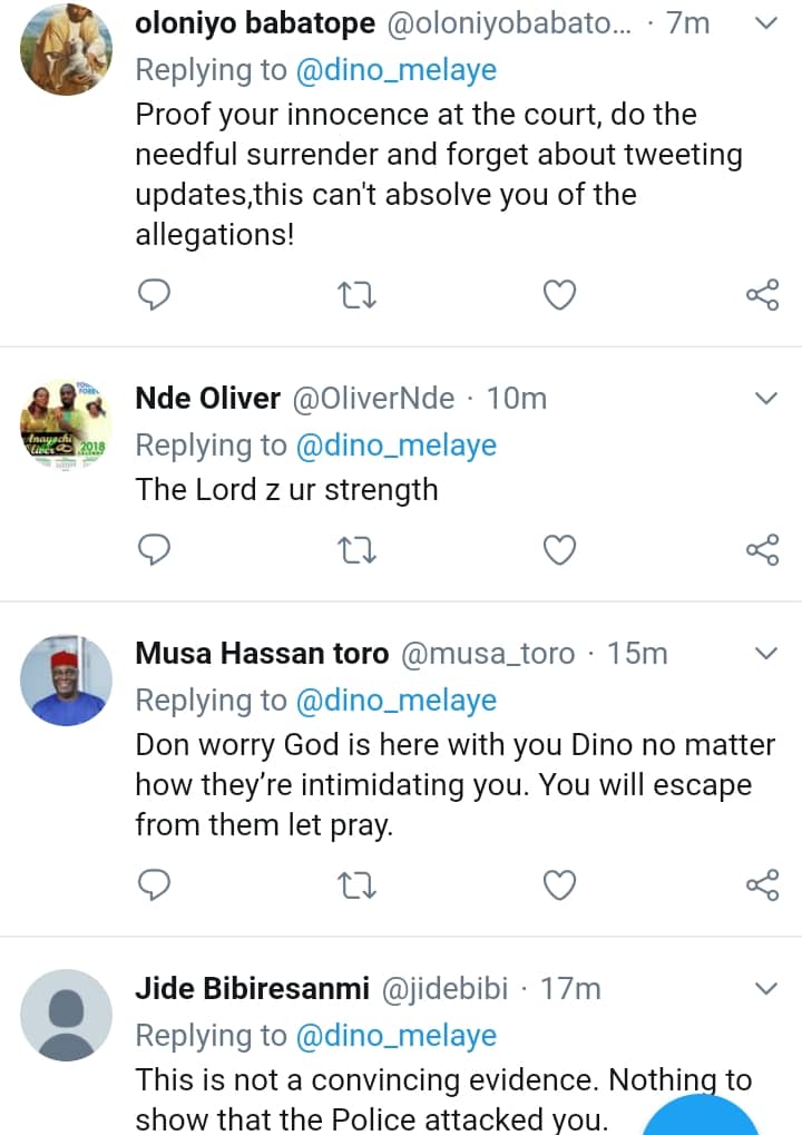 Meanwhile Nigerians have continued to react to the Dino Melaye Vs Police saga. While some have encouraged him, others have asked him to surrender to the police to stop himself from further embarrassment.