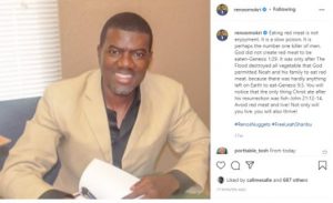 In a post shared on his Instagram page this morning, Reno opined that God did not create red meat to be eaten and that it is a slow ”poison.”