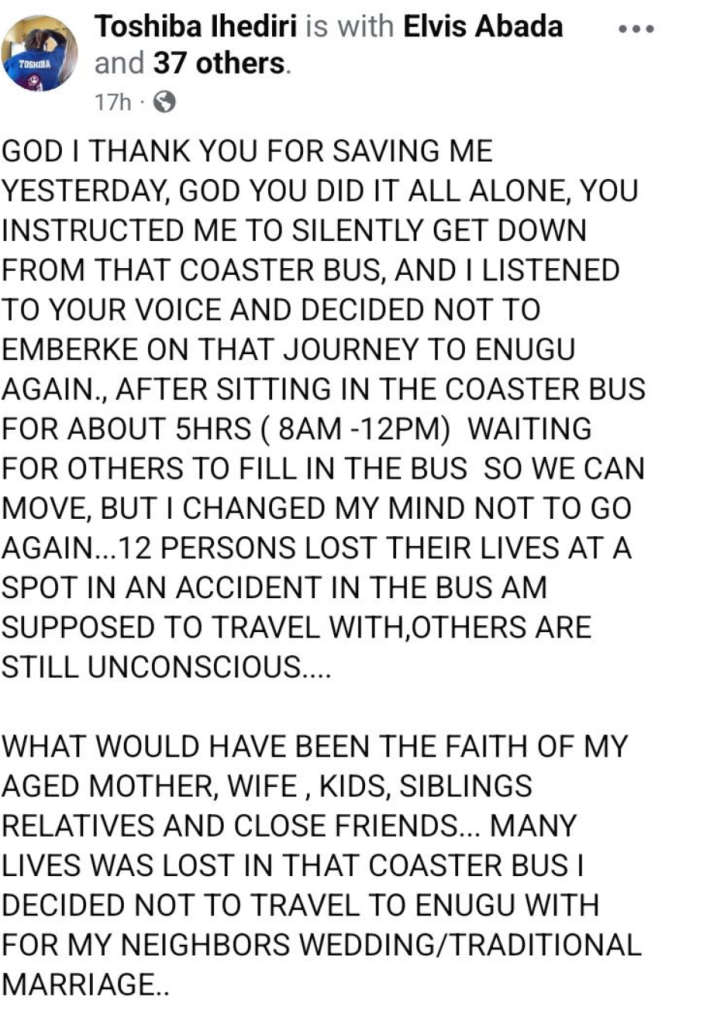 A Nigerian man, Toshiba Ihediri, has expressed appreciation to God for saving him from a road crash that claimed the lives of 15 Umuahia traders.