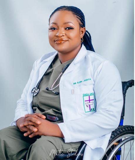 Dr Ejim Chinazom Judith, a physically challenged woman confined to a wheelchair took to Facebook to celebrate as she achieved her dreams of becoming a medical doctor.