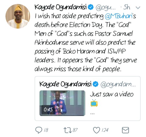 I wish that aside predicting @MBuhari’s death before Election Day. The “God” Men of “God”s such as Pastor Samuel Akinbodunse serve will also predict the passing of Boko Haram and ISWAP leaders. It appears the “God” they serve always miss those kind of people.