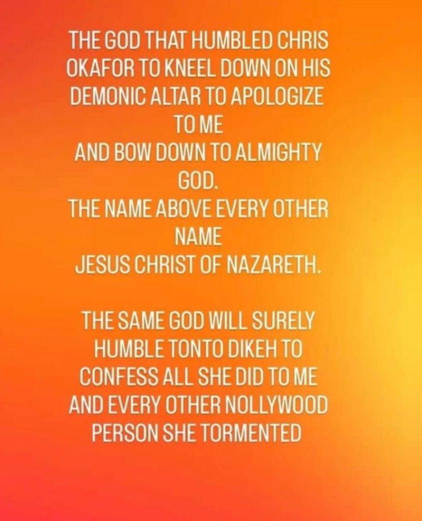 “The God that humbled Chris Okafor to kneel on his demonic altar to apologise to me… the same God will surely humble Tonto Dikeh to confess all she did to me and every other Nollywood person she tormented.