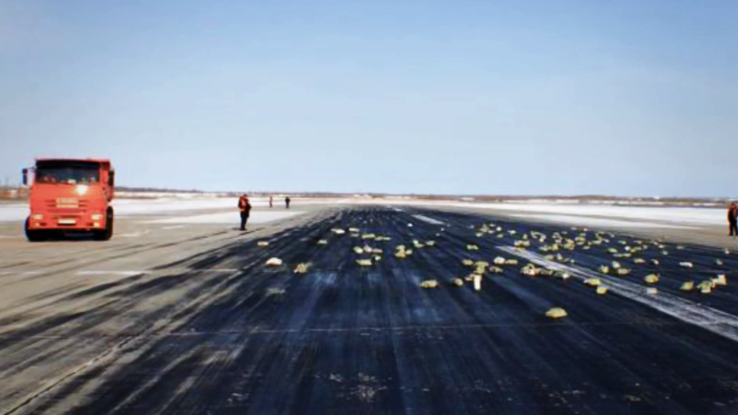 Some bars of gold landed a whopping 26 kilometres away from the airport. Police sealed off the runway and a vast search is underway to retrieve the easier to find blocks.