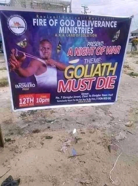 Goliath Must Die: Pastor Imoniero Poses With Catapult On Church Banner (Photo)