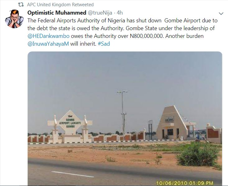 A Twitter user took this to his page expressing how sad he is for the new Governor of Gombe State, Inuwa Yahaya M as this debts will be transferred down to his tenure which was retweeted by APC United Kingdom.