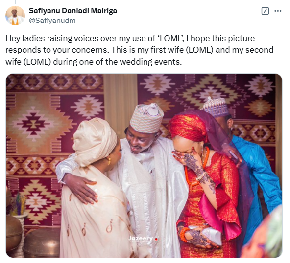 “Hey ladies raising voices over my use of ‘LOML’, I hope this picture responds to your concerns. This is my first wife (LOML) and my second wife (LOML) during one of the wedding events,” he wrote.