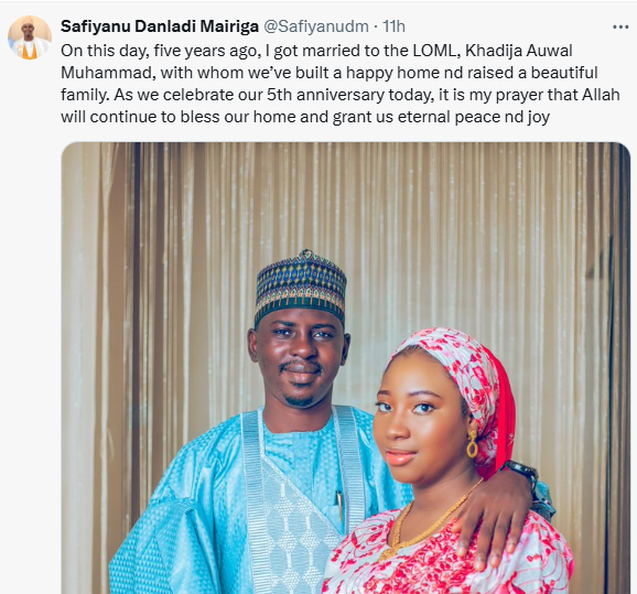 “On this day, five years ago, I got married to the LOML, Khadija Auwal Muhammad, with whom we’ve built a happy home and raised a beautiful family. As we celebrate our 5th anniversary today, it is my prayer that Allah will continue to bless our home and grant us eternal peace and joy.”