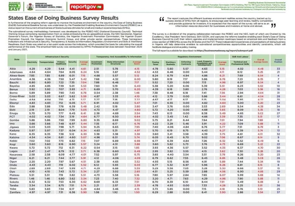 This was contained in a result of the State Ease of Doing Business Survey undertaken by the Presidential Enabling Business Environment Council (PEBEC) as a status report on the current attractiveness of states business climates for small and medium sized enterprises (SMEs).