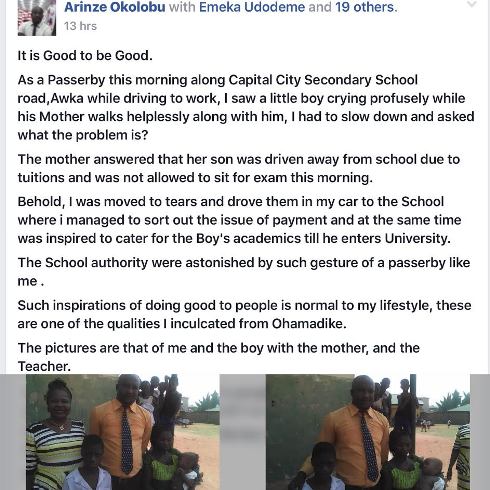 Arinze Okolobu, a Nigerian resident in Awka, came across a boy who was sent out of school and promised to pay his school fees henceforth.