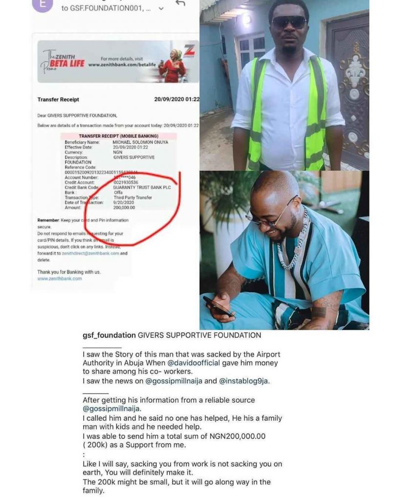 Although Davido is yet to reach out to the man, a good Samaritan gifted him N200,000 to take care of himself and his family till he gets another source of income.