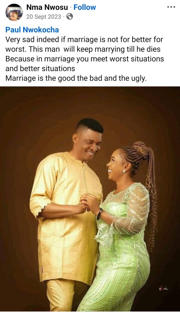 He also explained at the time that he “decided to marry my new wife, Goodness, one month after my ex wife packed out of our matrimonial home because the Holy Bible said Paul Nwokocha should not be alone.”