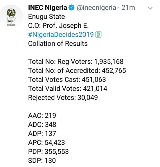 INEC yesterday declared PDP winner of the presidential elections in Enugu.