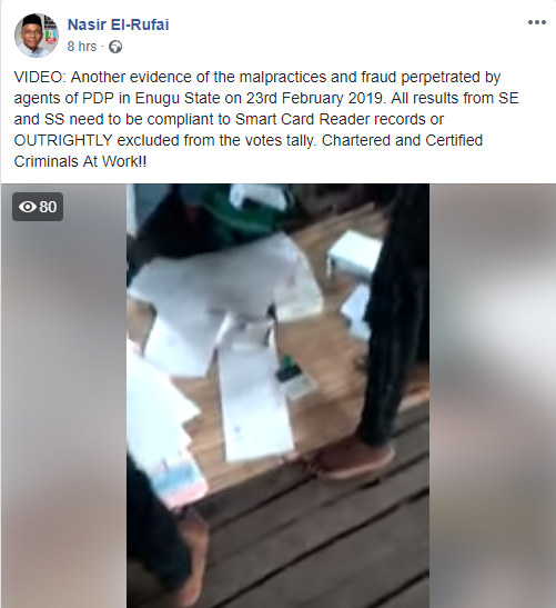 ”VIDEO: Another evidence of the malpractices and fraud perpetrated by agents of PDP in Enugu State on 23rd February 2019. All results from SE and SS need to be compliant to Smart Card Reader records or OUTRIGHTLY excluded from the votes tally. Chartered and Certified Criminals At Work!!