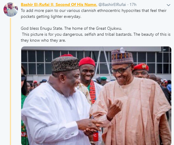 Bashir El-Rufai, son of Kaduna state governor, Nasir El-Rufai, had  posted a photo on Twitter last Sunday,  to celebrate Enugu state governor, Ifeanyi Ugwuanyi, for respecting President Buhari despite their different political and ethnic class. In his tweet, Bashir referred to Enugu state as the Home of the Great Ojukwu.