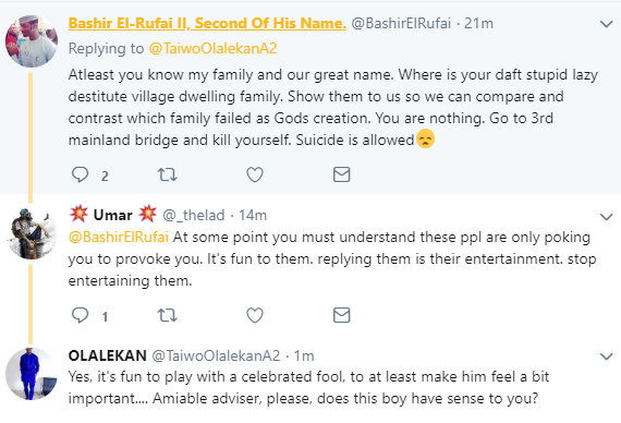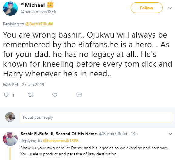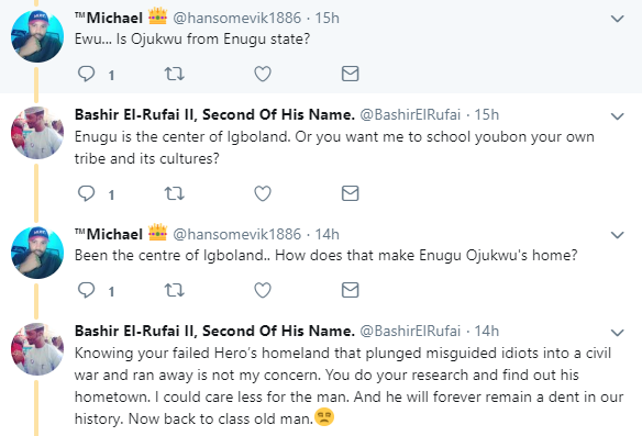 A Twitter user who is from the South East corrected him, howbeit disrespectully, that Enugu state is not the home of Ojukwu. Bashir found his comment disrespectful and the war of words ensued to the point that Bashir described the late  Biafran leader, Odumegwu Ojukwu as a failed hero.