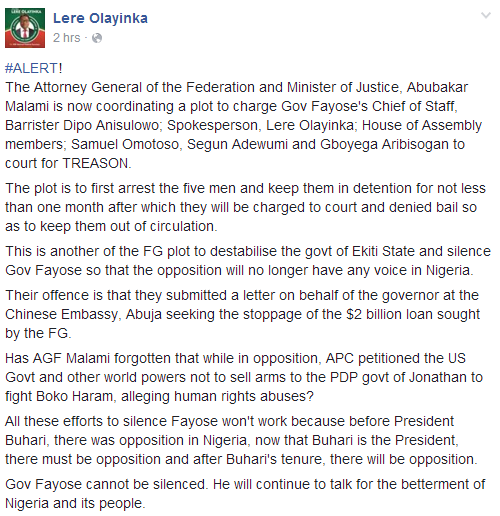 Lere Olayinka who is the spokesperson of Ekiti state governor, Ayo Fayose, is alleging that the Attorney General of the Federation is planning to charge him and 4 others to court for treason. Lere made this allegation on a post he shared on his Facebook wall this afternoon.