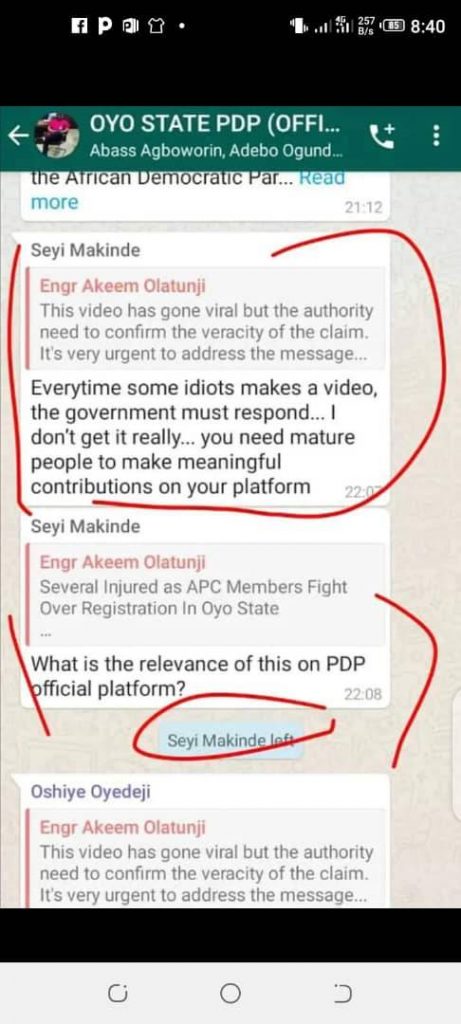 It took another dimension on Saturday night as the governor of the state, Seyi Makinde, left the official WhatsApp platform of the party in the state.
