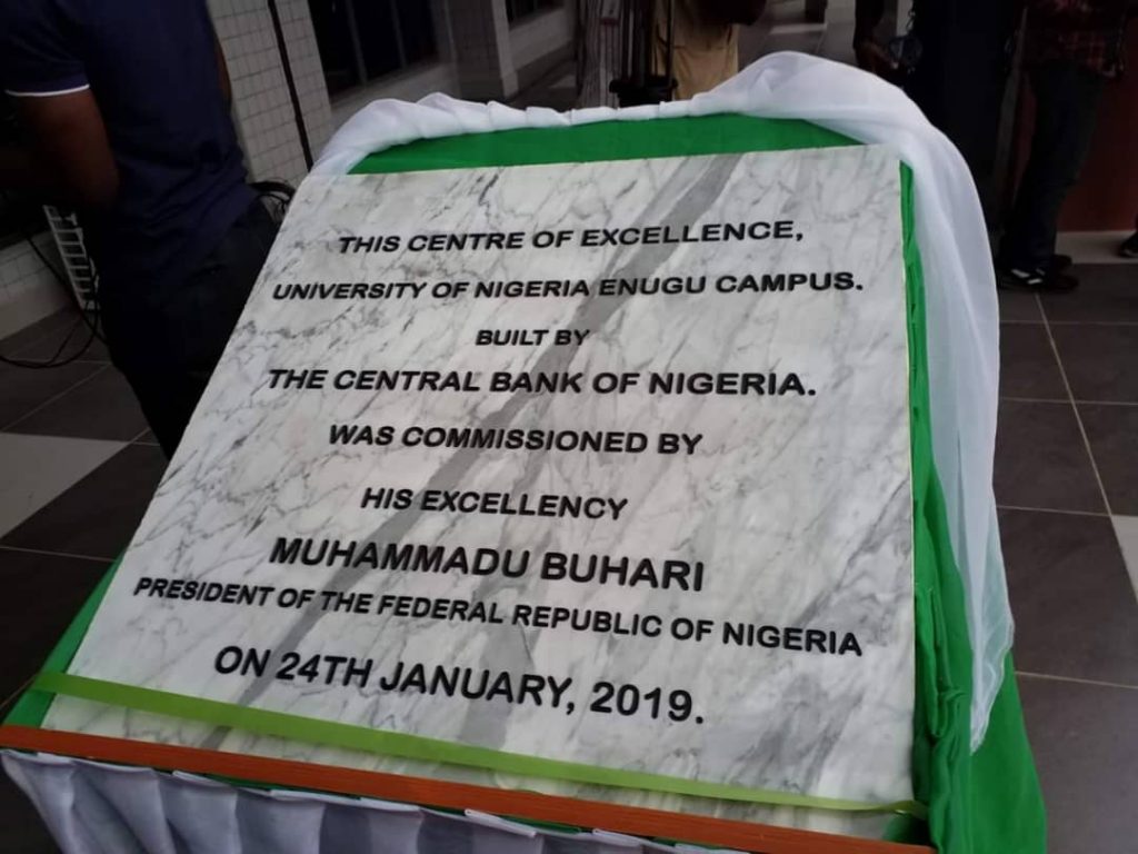 Governor Ifeanyi Ugwuanyi of Enugu State with President Muhammadu Buhari at the inauguration of the Centre of Excellence, University of Nigeria, Enugu State – a world class postgraduate school conceived by Central Bank of Nigeria (CBN) “to ensure students at postgraduate levels in Economics, Accounting, Banking and Finance, Business Administration and Statistics study in a serene environment that would stimulate effective learning with a view to building human capacity for the financial services sub-sector”.