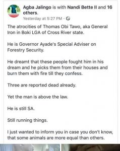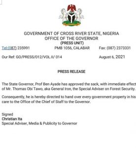 Governor, Ben Ayade has ordered the immediate sack of Mr. Thomas Obi Tawo aka General Iron, his Special Assistant on Forest Security.