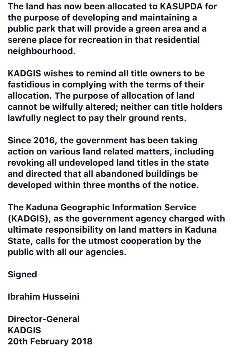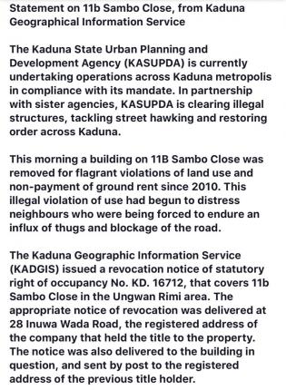 A building this morning was removed for flagrant violations of land use and non payments of ground rents since 2010. This land has now been allocated to KASUPDA for the purpose of developing and maintaining a public park that will provide a green area for recreation.