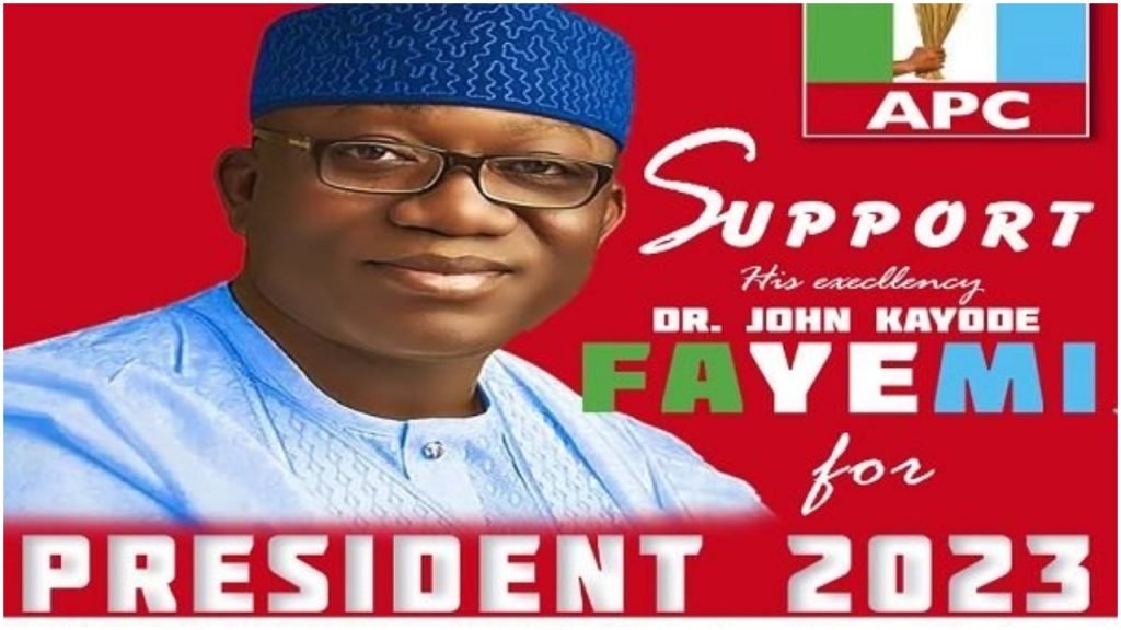 The message on the posters with APC logo read, “Support His Excellency Dr. John Kayode Fayemi for President 2023.” It has been confirmed that the posters was sponsored by the Chairman of Ikere Local Government Area of Ekiti State, Mr Femi Ayodele. According to TheNation, Mr Ayodele, said he did the posters to show his unalloyed and uncompromising loyalty to Governor Fayemi against insinuation that he was working against him. He said the governor is fit enough for the exalted office considering his array of outstanding credentials, administrative shrewdness and political acumen.