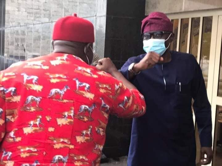 Photos shows the Lagos State Governor, Babajide Sanwo Olu receiving Governor Ikpeazu at Lagos House Alausa, Ikeja.