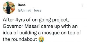 “After 4yrs of on going project, Governor Masari came up with an idea of building a mosque on top of the roundabout.”