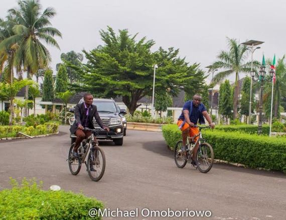 Governor Okorocha pictured on his morning workout cycling followed by his security team