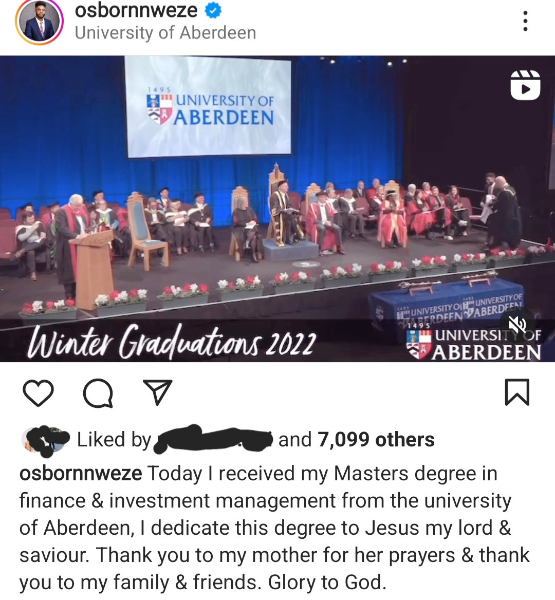 “Today I received my Masters degree in finance & investment management from the University of Aberdeen, I dedicate this degree to Jesus, my Lord & saviour. Thank you to my mother for her prayers & thank you to my family & friends. Glory to God.”
