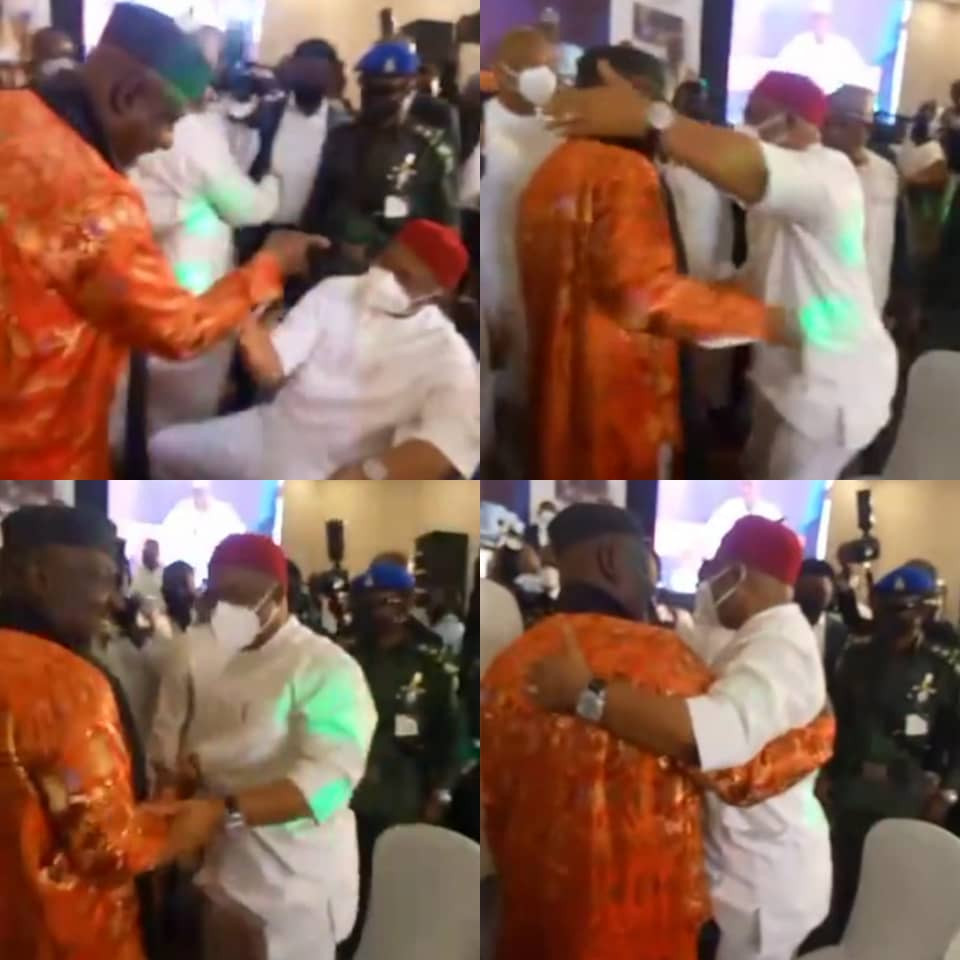 When he got to where Governor Uzodinma was seated, the governor got up from his seat, and both shook hands and hugged each other while smiling.