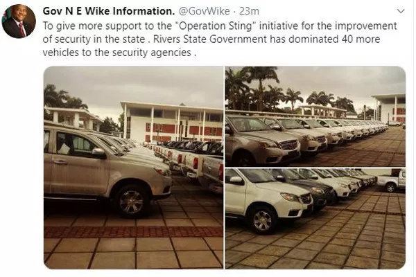 The governor made the announcement of the donation in a twitter post he captioned; “To give more support to the “Operation Sting” initiative for the improvement of security in the state. Rivers State Government has dominated 40 more vehicles to the security agencies”.