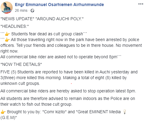 About five persons have been reportedly killed in a cult war that broke out last weekend and three more killed this morning. Making a total of eight in Auchi, Edo state.