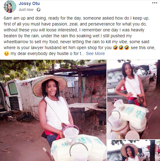 She wrote in another post “6am am up and doing, ready for the day, someone asked how do I keep up, first of all you must have passion, zeal, and perseverance for what you do, without these you will loose interested, I remember one day I was heavily beaten by the rain, under the rain tho soaking wet I still pushed my wheelbarrow to sell my food, never letting the rain to kill my vibe, some said where is your lawyer husband let him open shop for you see this one, my dear everybody dey hustle o for this regime, so if I want to buy sweet, oga lawyer, biscuits Mr lawyer, pad and small petite things I go wait for barrister lawyer.
