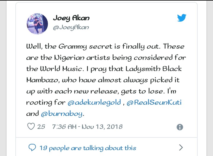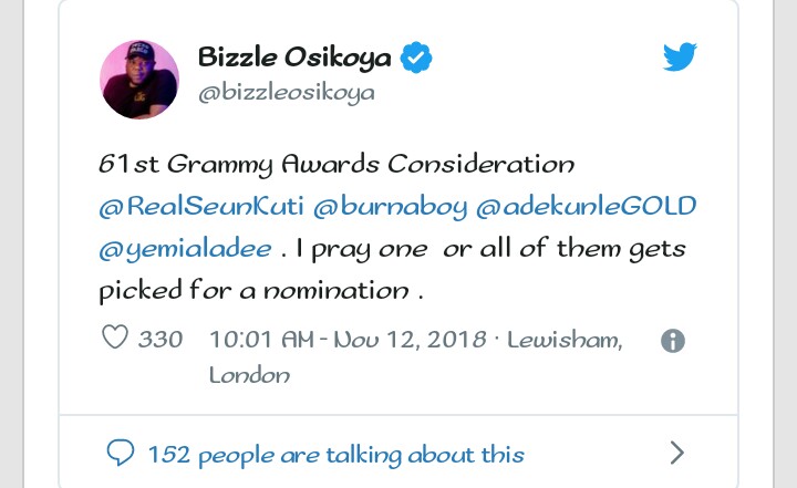 Some top Nigerian artistes, such Adekunle Gold, Yemi Alade & Burna Boy are set to be considered for a Grammy Award come 2019.
