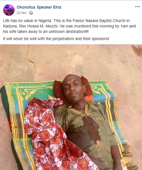 Unknown gunmen have killed a pastor identified as Reverend Hosea Akuchi moments after attacking Nasara Baptist Church, Guguwa, near Rigasa in Igabi local government area of Kaduna State. The pastor’s wife was also abducted by the gunmen as the kidnappers have placed a N5 million ransom on her head, according to reports.