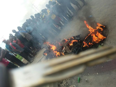An Okada rider was burnt to death by an angry mob for his involvement in a robbery at Finger bus-stop, Badagry Expressway, Lagos, today September 27th. Narrating what happened, an eyewitness said the bike man was shot while trying to escape with his accomplice after a robbery.
